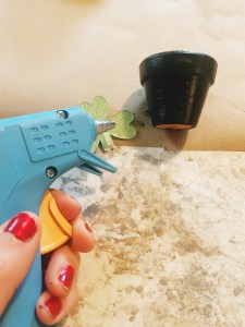 Then, using a heated hot glue gun, simply place a line of glue on the center of the clover vertically. Then push the clover onto the pot as a decorative touch. You’ll need to hold the clover to the front for a minute as the glue sets.