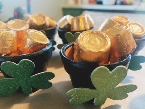 Fill your dried pots with about 4-6 Rolo candies, still in their gold wrappers. My mini pots held 5 really well. This should look like a completed pot of gold to celebrate St. Patrick’s Day with a little sweet treat!