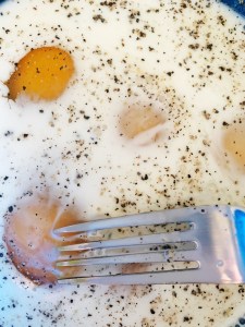 Then in another mixing bowl, combine your eggs, milk, and salt and pepper. Whisk until its mixed together very well.