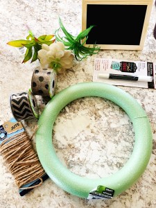 Now that your hot glue gun has likely heated up enough, you can begin to assemble your wreath. I started with wrapping mine with ribbon. I simply wrapped around and used dots of hot glue to secure the ribbon in place. I did use both patterns on mine, but to be even simpler, you could use just one pattern of ribbon. I did use some jute where my chalkboard was going because I felt like it might create a sturdier hold.