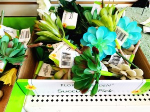 First, you’re going to want to prepare all of your materials. The first thing you’ll want to do is heat up your hot glue gun. As this heats, de-stem your faux succulents. Dollar Tree has a variety of these floral accessories, making it easy to choose the look you want for your space. Once you’ve chosen, you can cut off the brown stems and work with just the plastic leafy sections.