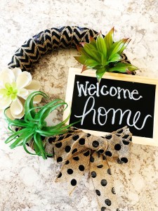 Next, you’ll want to use your chalk pen to craft a message on your wooden chalkboard. I simply wrote “welcome home” since it was going to be in a doorway. In my home, you can see the back kitchen door as soon as you walk through the front entry way, so I felt a “welcome” message was appropriate. I could have also gone with a more kitchen-themed phrase or a monogram.
