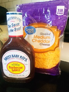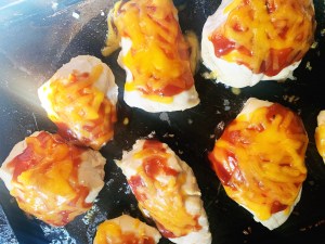 I spread on the sauce so it’s over the top of each piece of chicken. Next, sprinkle some of your shredded cheese on top of the barbecue on each piece.