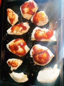 When the chicken is done in the oven, pull it out. Drop a dollop of barbecue sauce on top of each piece (unless you’re making some plain for your picky eater, too!). I always swear by Sweet Baby Ray’s – it’s a staple in our house!
