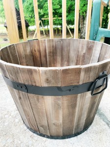 I’ve been on the lookout for a wooden barrel planter for a while now. These things get kind of pricey, and, I guess with the price of lumber right now, that shouldn’t be surprising. And while Lowes has plastic ones l for about $15 bucks, I don’t really love the look of faux wood in a fire pit area where you’re going to be setting it next to authentic wood. Having said that, I think those are a great option if you can’t find an affordable one or if you’re using a heavy plastic material in your lawn furniture.