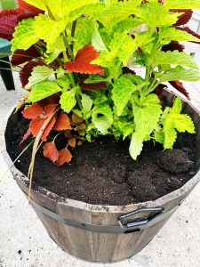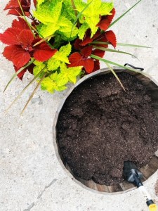 I also use this opportunity to grab some plants. I typically like to buy my own variety of plants and create my own arrangement in my planters, but with the size of this large wooden barrel planter, I decided it be easiest and most affordable to just grab one of these ready to go filler kits from Lowe’s for just under 15 bucks. This one features coleus and other plants that need a medium-level of sun, perfect for the fire pit area that does receive shade from the nearby trees but also gets some direct sunlight in points of the day. I do recommend these filling kits if you have planters that you fill each year – they are a great price and they already pair plants that do well in the same type of lighting. Definitely gardening at it’s easiest!