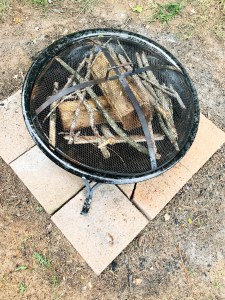 We first cleaned up all of the old ash and half burned log, and we really just tried to clean up that area so we had a blank canvas to work with. Jake’s dad had given us a used portable fire pit back when I was at my rental house. Since the fire pit area at the new house didn’t have an actual ring, we thought this would be a great fix for right now until we get to figure out how we want to actually build a stone fire pit in the future. There were already some landscaping steppingstones at the house when we purchased it. They are a little mismatched, and a few of them are chipped or broken, but we were able to piece together a diamond of stone to put our portable fire pit on top of.