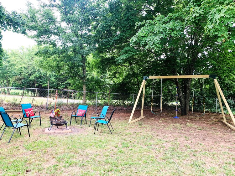 So we both have this vision of a really inviting and warm backyard. This house had a really plain backyard with a lot of potential when we bought it. There are really big, established trees to provide a good source of shade, which is perfect for Tennessee summers. With a spot already having been broken in for a fire pit, we knew that adding our own fire pit would not be too challenging. And there was a perfect corner for us to add swingset for a Little Man.
