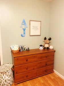 The moose stuffed animal was a first Christmas gift from Santa, the light is a night sky rotating lamp from my parents on AJ’s third Christmas, and the photos are of AJ with me, my father, and Jake respectively. The basket contains some wipes and pull ups – we’re potty training and he’s doing GREAT through the day, but still needs pull ups at naptime and bedtime. I thought a basket made it look a little neater.