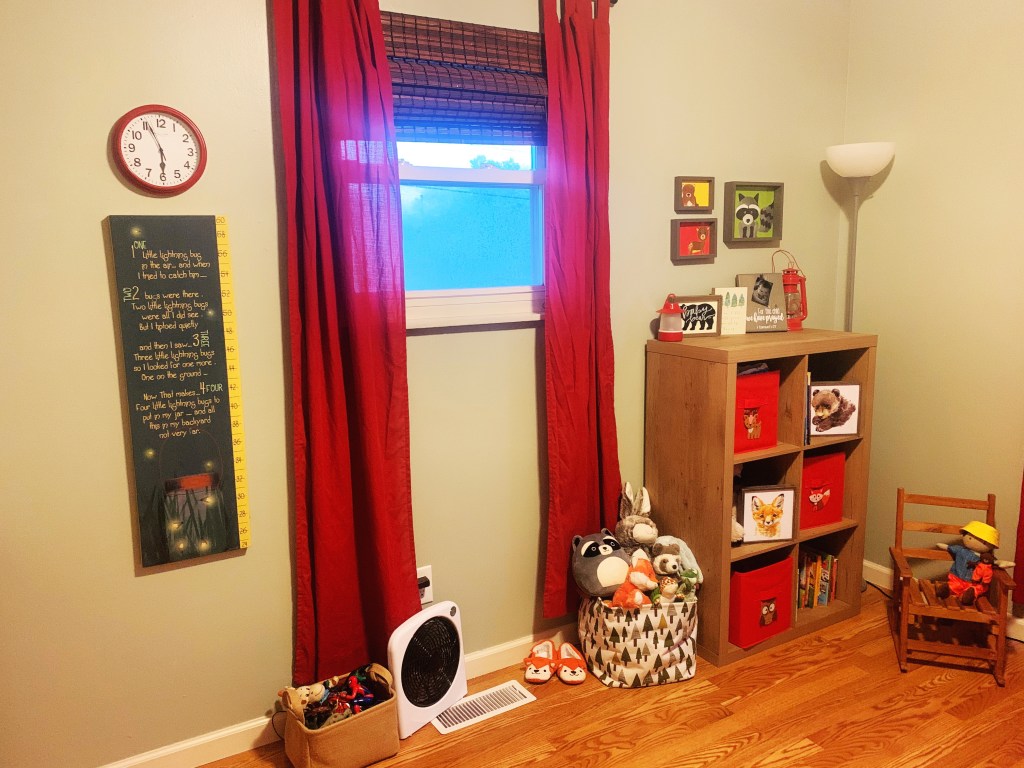 On the next wall, we have one of his two windows. I framed these in red for two reasons. #1: It’s his favorite color and he asked me for a red room at the new house when he learned that we were moving. I was NOT painting the room red – while it might work in some spaces, the house I bought in my first marriage had a red room and painting over it was ridiculously hard. I want to avoid that for the future if possible. #2: Remember how I said that I really fought for some nursery items that were sentimental to me? Well a very sweet woman at my church quilts – and she’s SO talented. She made my little man a quilt for my baby shower that had brightly colored forest animals on it, and I absolutely wanted that quilt in AJ’s future room. She’s a friend of my family from the church I grew up in, so I asked for that quilt. I am so grateful to have it for my kiddo in this room, and red matched it well.