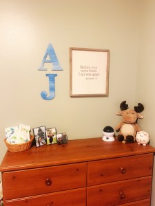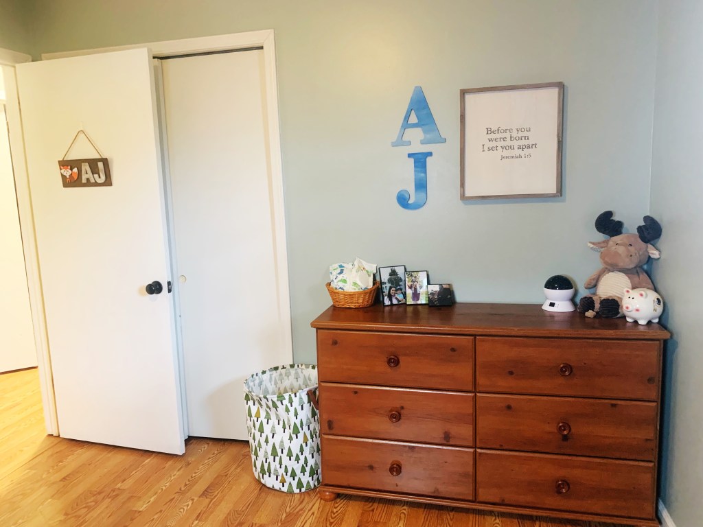 The dresser is filled with his clothes – and sometime in the future I’ll have to share my dresser organization tips – but the décor around the dresser is what I really wanted to show you all. The initials were a gift from my sister – when she and my mom’s best friends (loving dubbed my “extra mommas”) threw my baby shower, my artist sister painted these blue ombre initials. The Jeremiah verse hanging was from AJ’s nursery when he was first born – the J in his name stands for Jeremiah, and this is the verse I prayed over him during my pregnancy. When my divorce was finalized, I was adamant about getting these wall hangings because they were so sentimental to me. As a side note – and other divorced mommas will get this – splitting up households is NOT fun or easy, and it takes some bartering, but I’m such a sentimental person that I really tried to split up things that would have sentimental value to each parent – for example, my ex-husband’s aunt and uncle had built AJ a toy chest, so I made sure to communicate that the toy chest belonged to him since it came from his family and they would want to see AJ enjoy it when he was with his father.
