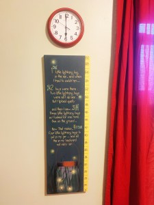 Tying into the red accent color, I grabbed a red framed clock from Walmart and paired it with this adorable firefly growth chart that my parents bought for AJ from Mast General Store. If you’re not familiar with Mast General Store, you should be! Such a cool place.)