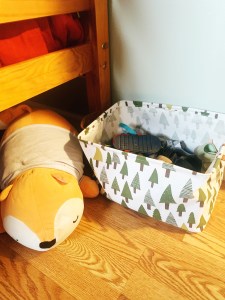 The final photograph in this section is his shoe bin (again, matches the stuffed animal bin and the laundry basket) and his large cuddly fox. The fox was a gift from a friend for AJ’s first Christmas – and he used to cuddle this so much! Now that he’s bigger, he doesn’t crawl on it and cuddle as much, but I think it’s still so sweet and adds to the room.