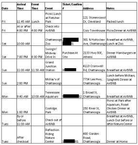 I also pre-bought tickets so I would reserve spots at various activities, learn about their COVID measures and requirements in advance, and get all of the parking and address information. I put all of that information in a spreadsheet that I shared with Jake in advance.