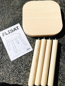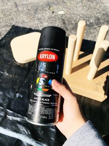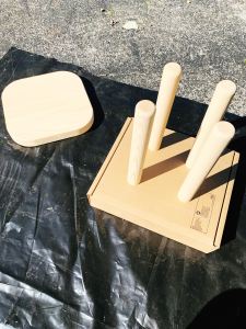 I started by opening up my boxed stool (which comes with screw-in legs). I laid the top of the stool on a piece of black plastic so I wouldn’t end up spraying the driveway, and I screwed the legs into the box to hold them upright for painting. I spray painted everything black.