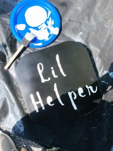 Once all of the black paint was dry, I let my son help me stencil on the white lettering. We chose for ours to say “Lil Helper” but you could do anything – “Kitchen Aid” or a kitchen saying or “Sous Chef” or whatever works for you!
