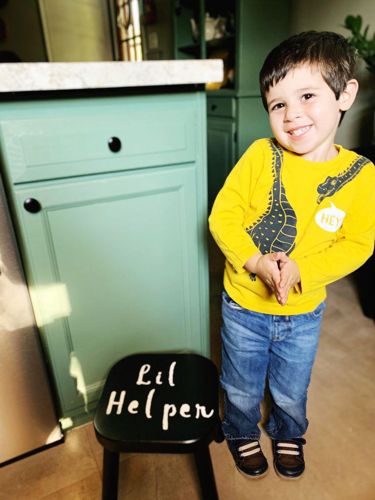 I don’t know about your kiddos, Momma Hen friends, but my son is a huge fan of helping in the kitchen. If I’m cooking or baking, he’s helping. Of course, there is a hindrance – his height. He can’t reach the countertop on his own.
