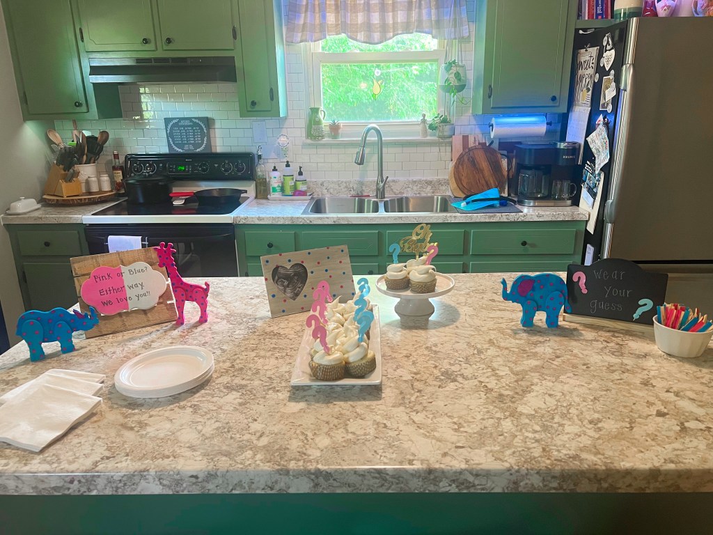 Here’s a peek at our whole setup for the gender reveal party! We decorated just the island in the kitchen since it was just a dessert reveal in the evening.