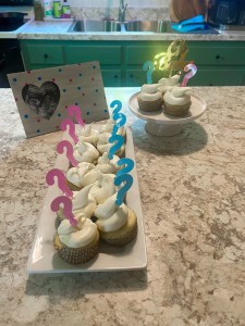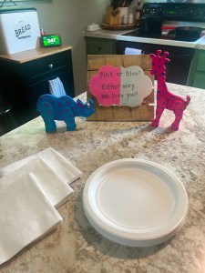 So we went affordable and DIY with our gender reveal. I bought almost everything from Dollar Tree – wooden animals, paint, a frame, a cake topper, cupcake mix and icing, clothes pins, and dessert plates and napkins. I did buy some pink and blue question mark cupcake toppers from Hobby Lobby, and I bought a wooden stand and plaque from Dollar General, too.