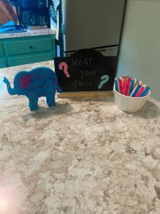 I also painted a wooden plaque half pink and half blue. When it dried, I wrote in sharpie, “Pink or blue, either way we love you!” Then I got glued the plaque to the slatted wooden stand.