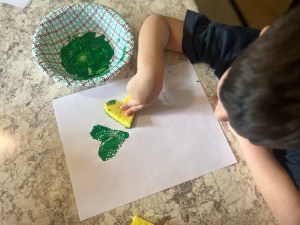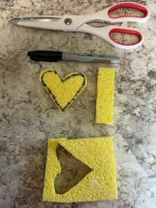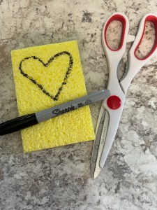 For this activity, I bought sponges at the dollar store and utilized a sharpie, scissors, green paint, and paper that I already had. First, I cut my sponge into one heart-shaped sponge and one small rectangle. Then I filled a disposable bowl with green paint.