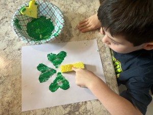 The heart served as the leaves of our shamrock. Then using the rectangle piece of sponge, we put paint on one side and stamped it underneath the pointed parts of the heart to make the stem of a shamrock.