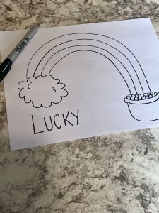 Using a sharpie, I sketched an image of a cloud with a rainbow, bowing out of it, and into a pot of gold. This is a fairly rough sketch, but it did the job. I even made myself a copy so that I could do the project with my four-year-old.