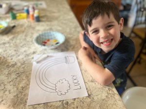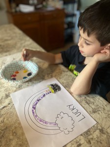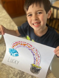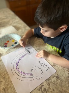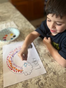 I helped AJ decide which color should go in each spot. Then I helped him dip his Q-tip in the paint and had him put dots of paint in between the lines to make the image come to life with colors. I’ve done this before in a similar craft or we focus on the story of Noah’s ark. I’ll link that here. For today it was kind of fun to have that lucky part of golden rainbow as a symbol of St. Patrick’s Day.