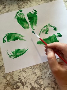 For this project, I used green paint, poured into a disposable bowl, white paper, a paint brush, and my infant’s two little feet.
