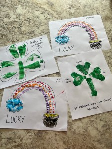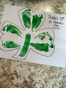 This is the project that I was able to do with my infant. Teddy is four months old, and I had the thought that I’d like to have something that has his little footprints on it for his baby book or a family album. This project will be perfect as a keepsake, and for now it’s hanging up in our kitchen as St. Patty’s Day decor.
