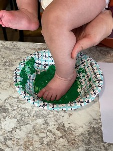 I will note that the first time I got too much paint on his foot. We ended up using a second sheet of paper, and I wiped the excess paint off on it before making the art project on a clean piece of paper. Not all of the prints turned out perfectly, but that’s okay. It’s still turned out really cute – and I can’t blame him for having wiggly toes when experiencing the sensation of paint for the first time.