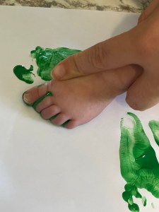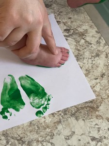 I simply dipped his bare feet into the green paint, and then gently press them onto the paper to make a transfer of his footprints.