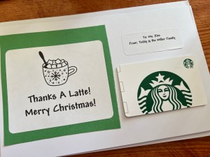 I put a little message (with the “to” and “from” details) on the smaller address label and a cute mug image and “thanks a latte” message on the larger shipping label. I used tape to attach the gift card and glue to attach the construction paper right behind the larger shipping label.