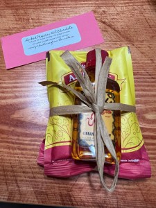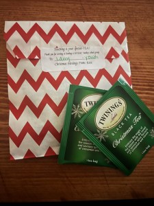 This holiday season, to thank them for leading our classes, I used small festive treat bags, 2 packets of Twining’s Holiday Teas, and address labels printed with a cute saying.