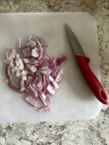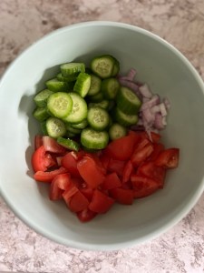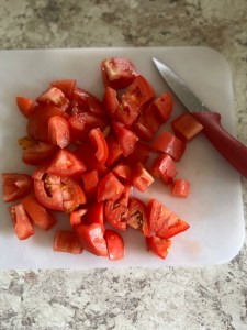 Chop a few slices of red onion. Dice your tomatoes into large – but bite sized – chunks. Then place all three in a mixing bowl.