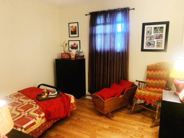 Here’s the bed – and the BEAUTIFUL handmade quilt from Ms. Sandy at church. How beautiful is this?! I paired it with white sheets and some throw pillows I purchased a few years back at a thrift shop. The end table was already in the guest room and I got it from a local furniture outlet in my home county – for my East Tennessee friends, check out Dandridge Furniture Outlet but remember to have cash! Again, the mirror was repurposed from the bathroom when we moved in – and I love that it really goes from end to end of the top of the futon. Since it’s basically a bed without a headboard, I like that the mirror kind of creates a pseudo-headboard illusion.